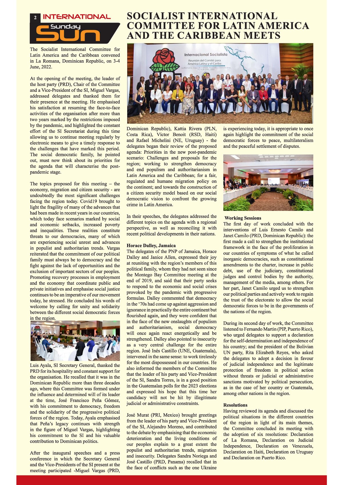 En La Romana, República Dominicana, los días 3 y 4 de junio de 2022, se celebró la reunión del Comité para América Latina y el Caribe de la Internacional Socialista. Al inaugurarse el encuentro, el líder del partido anfitrión (PRD), presidente del Comité, y vicepresidente de la IS, Miguel Vargas Maldonado, se dirigió a los presentes para agradecer su presencia en el encuentro, recalcar su satisfacción por estar retomando las actividades presenciales de la organización tras más de dos años marcados por las restricciones impuestas por la pandemia y destacar el esfuerzo constante del secretariado de la IS que ha permitido en este período seguir encontrándose regularmente por vía telemática para dar respuesta oportuna a los desafíos que han marcado este bienio... Read more