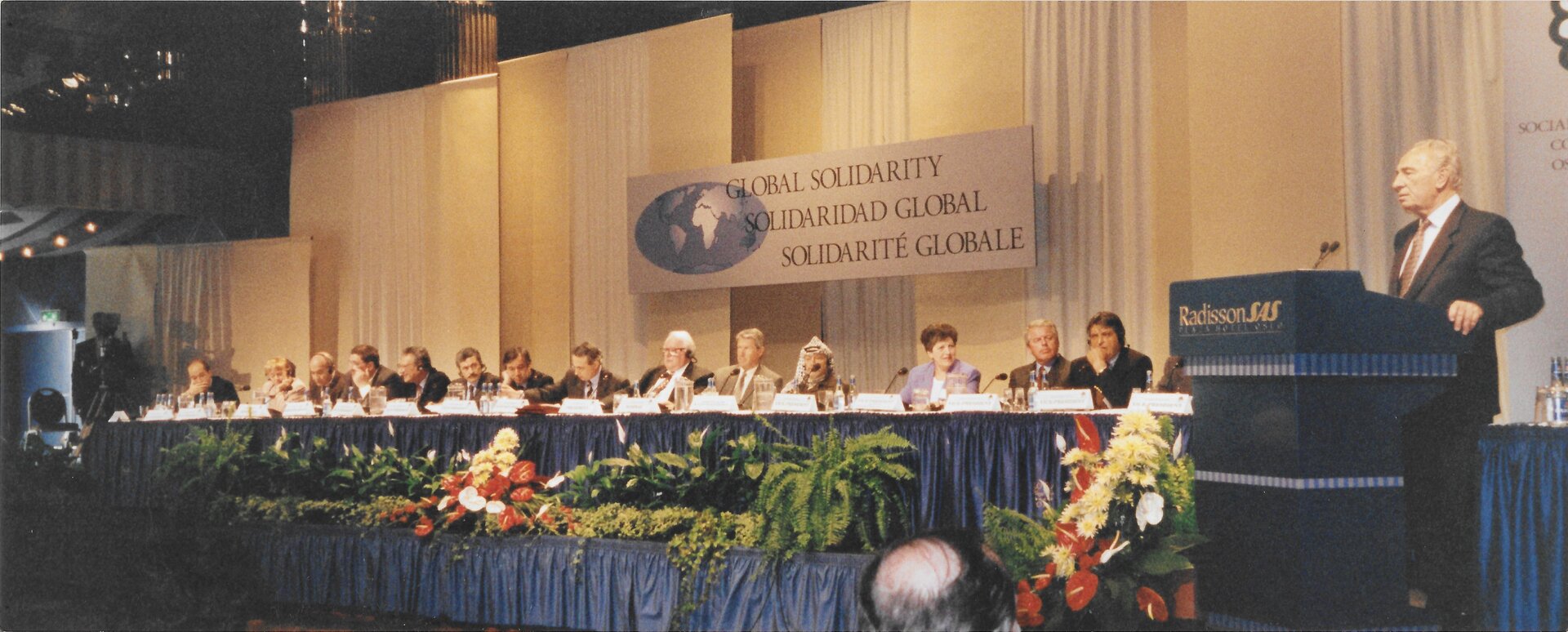 Des orateurs d'introduction au thème s'intéressant au Moyen-Orient, à l'Irlande du Nord et à la Bosnie-Herzégovine, se sont exprimés sur le premier des trois aspects du thème principal - `Favorisant l'action humanitaire et promouvant les initiatives pour la paix' - et ont rendu compte de leurs différentes expériences. Yasser Arafat, président de l'Autorité Palestinienne, a parlé des efforts constructifs de l'Internationale pour soutenir une paix juste, permanente et entière au Moyen-Orient, ainsi que de ses inquiétudes pour le futur: `L'alternative qui s'ouvre à nous si le processus de paix échoue dans la région, est un chaos total. Et il sera très difficile de prédire l'ampleur et les dimensions d'un tel chaos.' Partageant les inquiétudes d'Arafat, Shimon Peres, ancien leader du Parti Travailliste Israélien, a déclaré: `Je ne crois pas que nous puissions atteindre 100 pour cent de paix sans donner 100 pour cent de liberté aux Palestiniens, que nous puissions obtenir une sécurité à 100 pour cent sans avoir 100 pour cent de paix.'